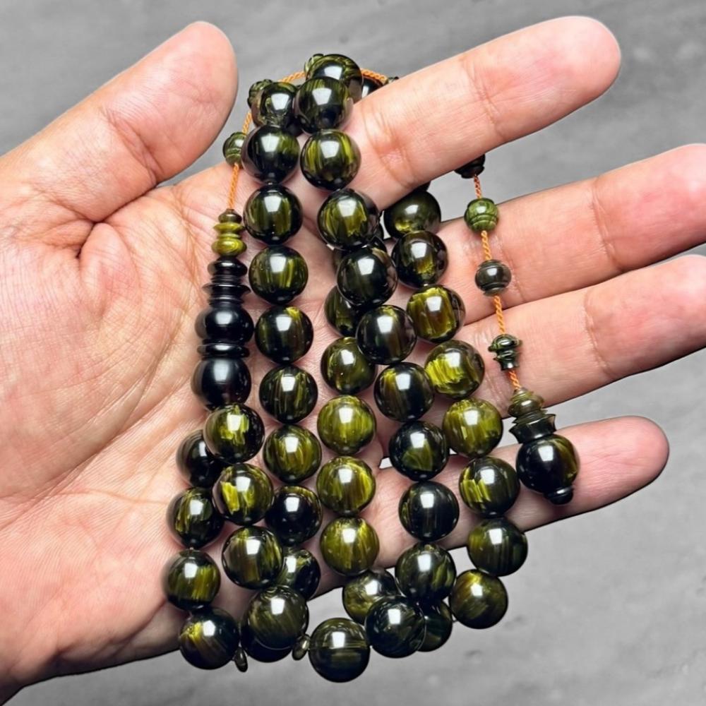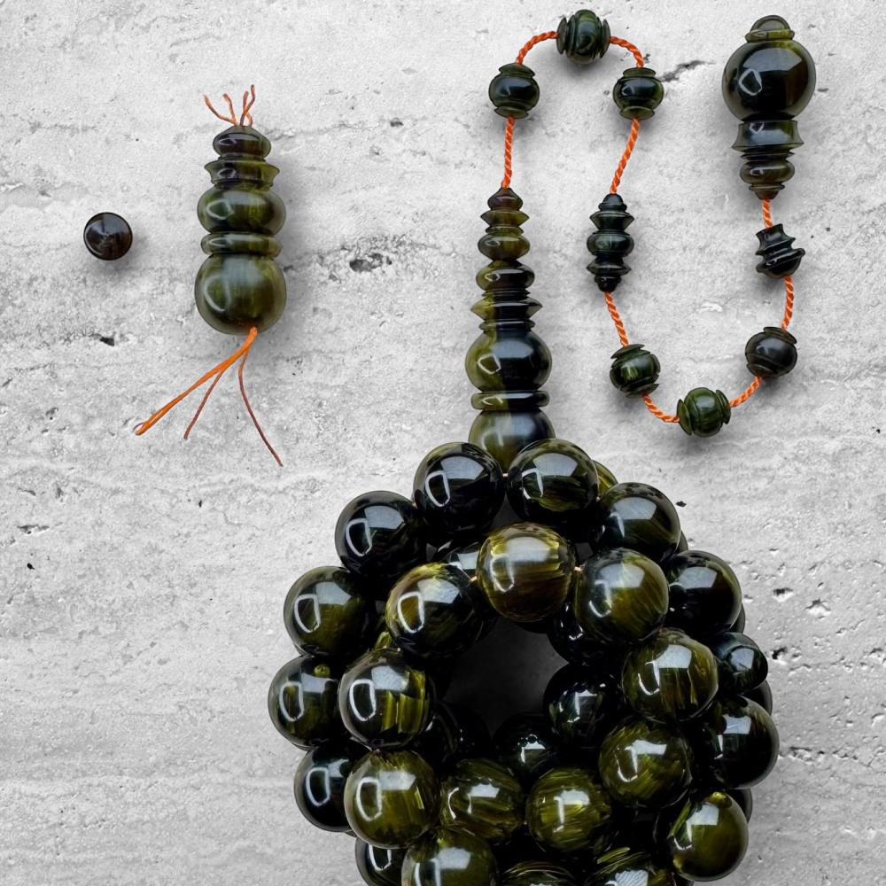 - مسباح من عصي بكلايت بلون زيتي و بتعريق خراطة إبراهيم الدكتور يأتيك بتمليكة ستات محززة ومشكوكة بأجود خيوط الحرير.