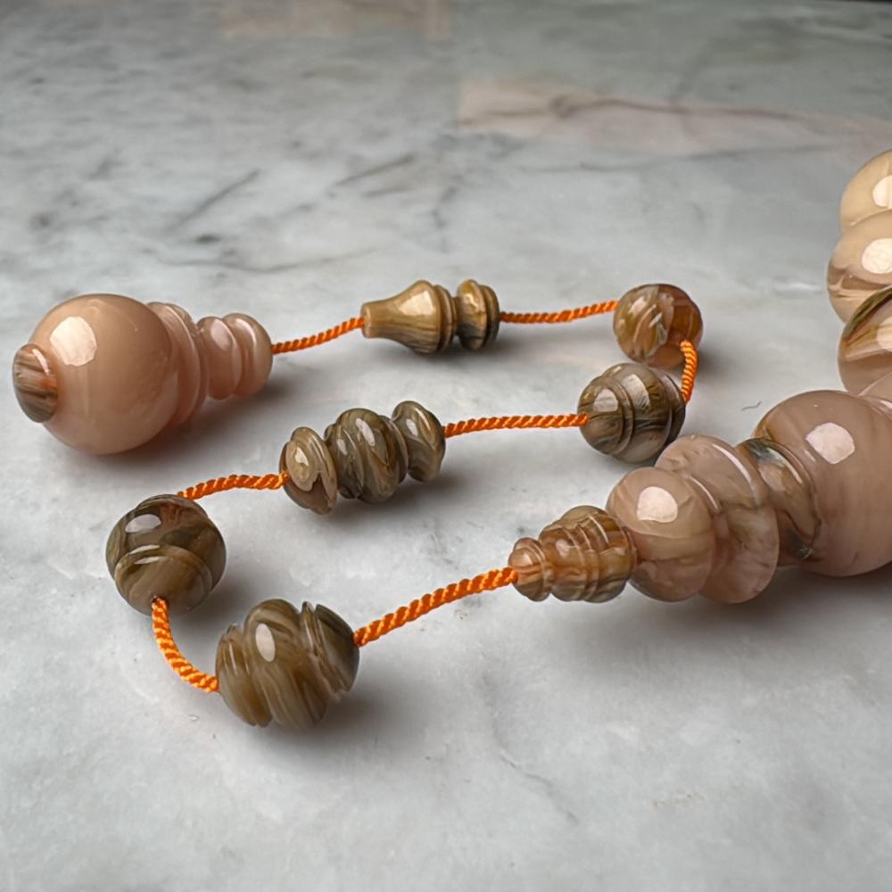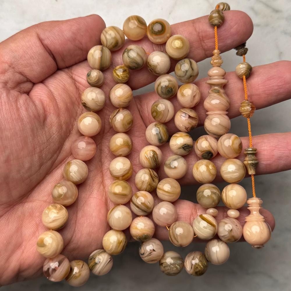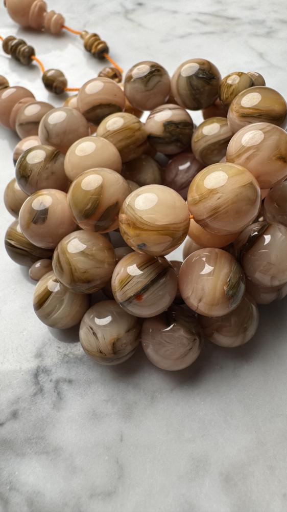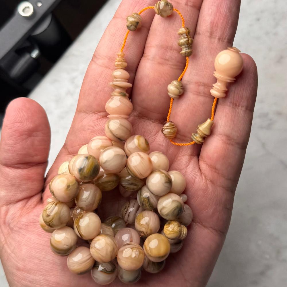 مسباح من عصي بكلايت معرق بتصميم تركي فاخر ولمسة عربية أصيلة تجمع بين جودة الخراطة ودقة النقش اللي تخليك تحس بالتميز في كل خرزة بشكل راقي يلفت الأنظار.