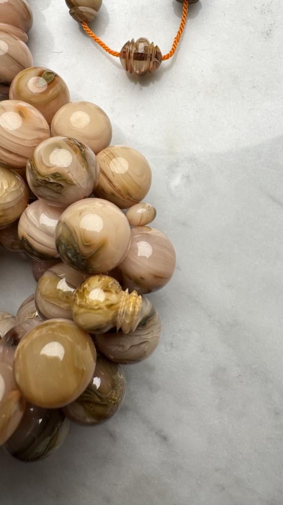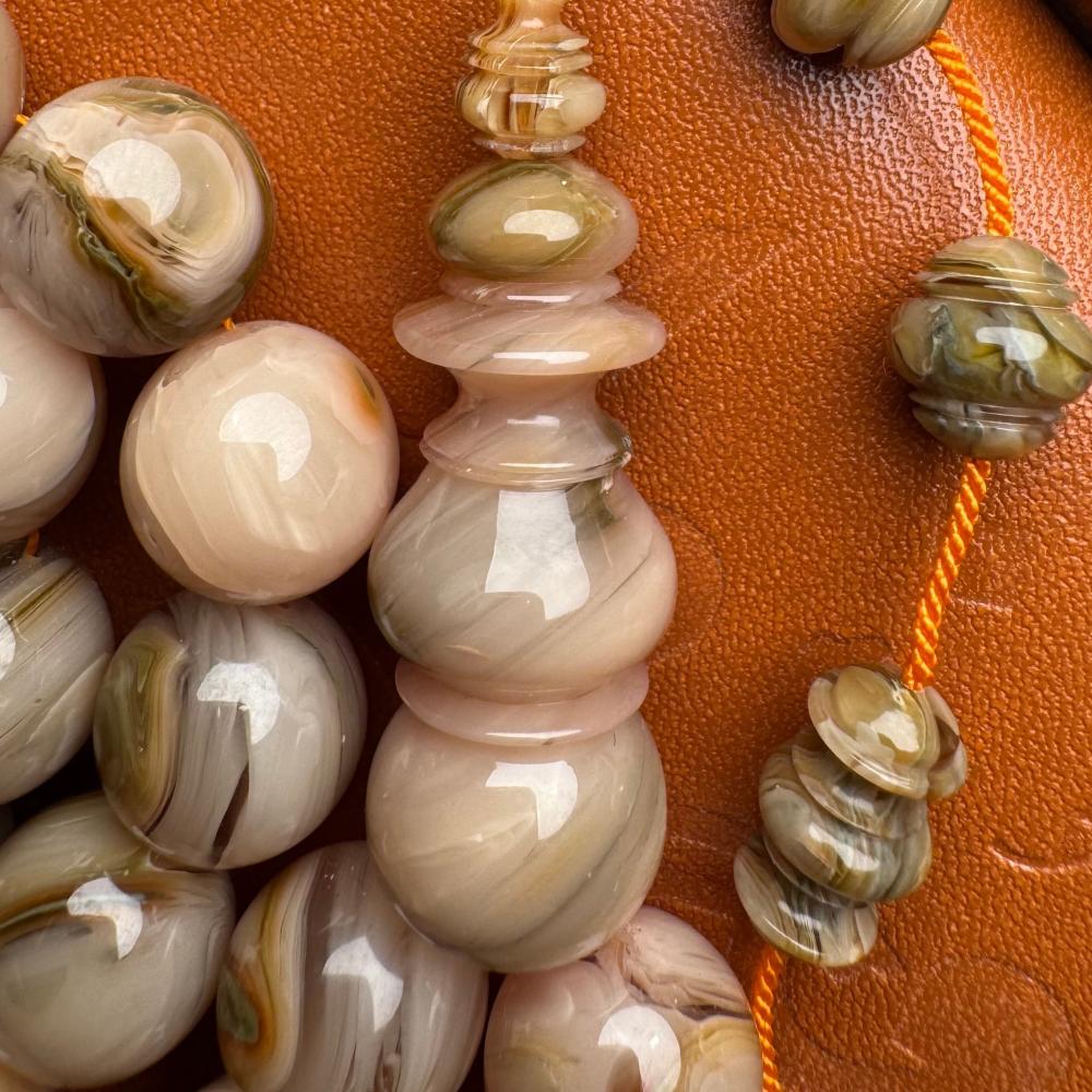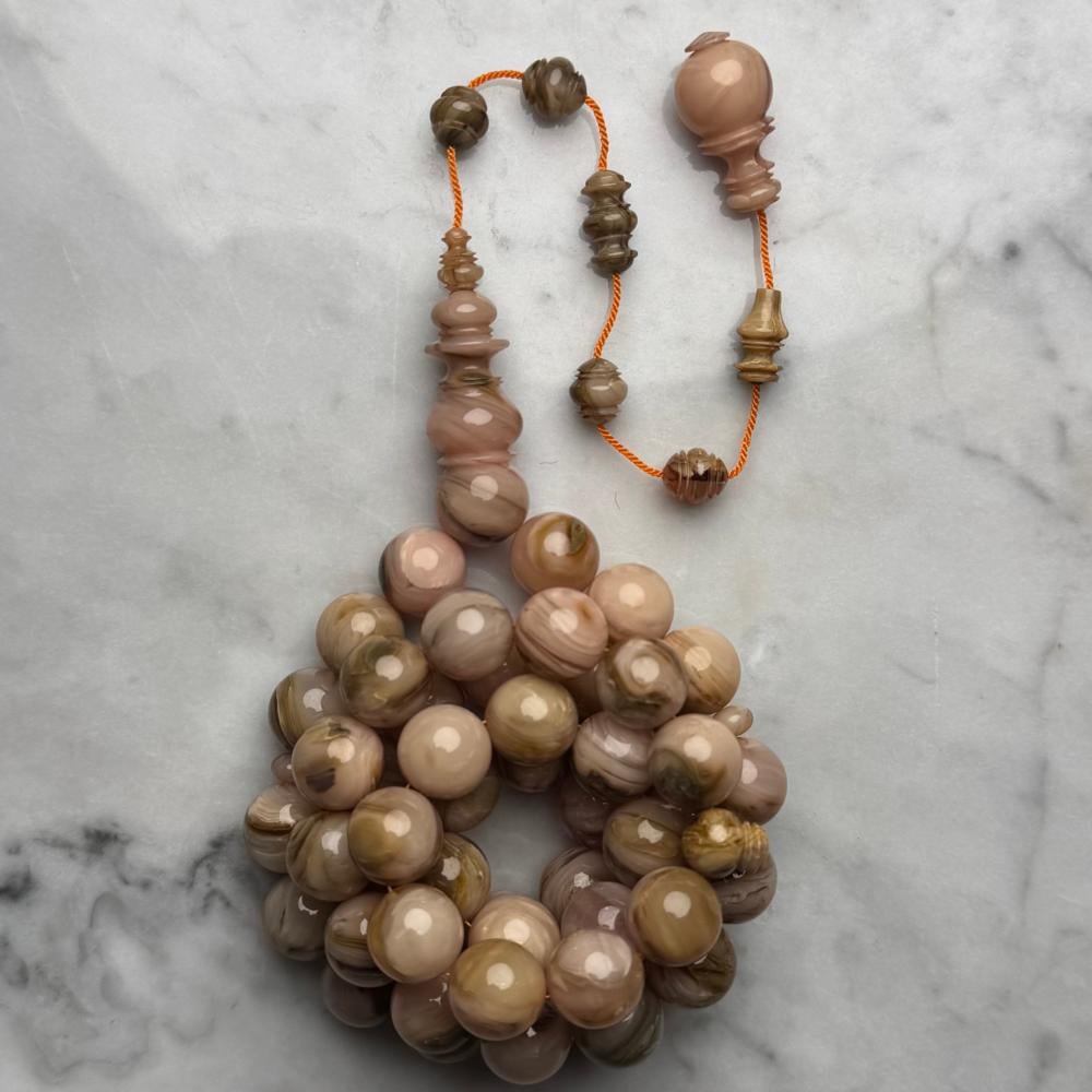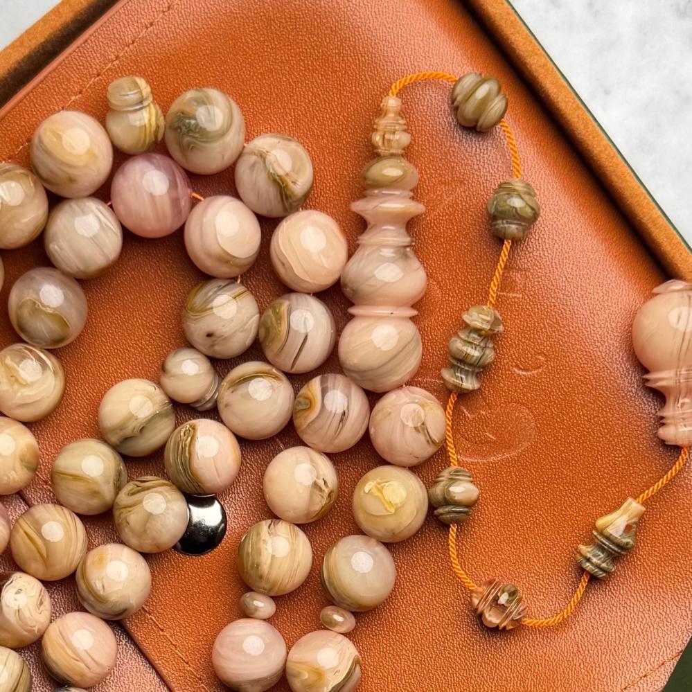 مسباح من عصي بكلايت معرق بتصميم تركي فاخر ولمسة عربية أصيلة تجمع بين جودة الخراطة ودقة النقش اللي تخليك تحس بالتميز في كل خرزة بشكل راقي يلفت الأنظار.